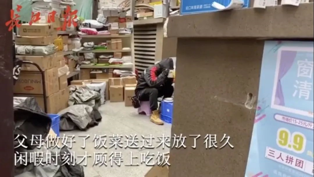 在一次媒體采訪(fǎng)中,一位快遞小哥始終背對鏡頭整理貨品,僅在空檔時(shí)間坐在小板凳上吃?xún)煽诟改杆蛠?lái)的飯菜?!拔业迷趰?,不然武漢人民的口罩怎么???”
