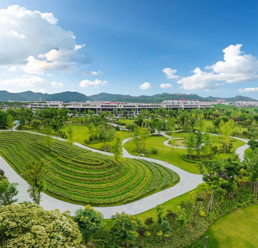 園區保存了較為完整的原生態(tài)自然環(huán)境,綠化率達98.5%,常年平均氣溫17.3℃,相對濕度78.5%,四季鳥(niǎo)語(yǔ)花香,氣候溫和濕潤,風(fēng)光旖旎。