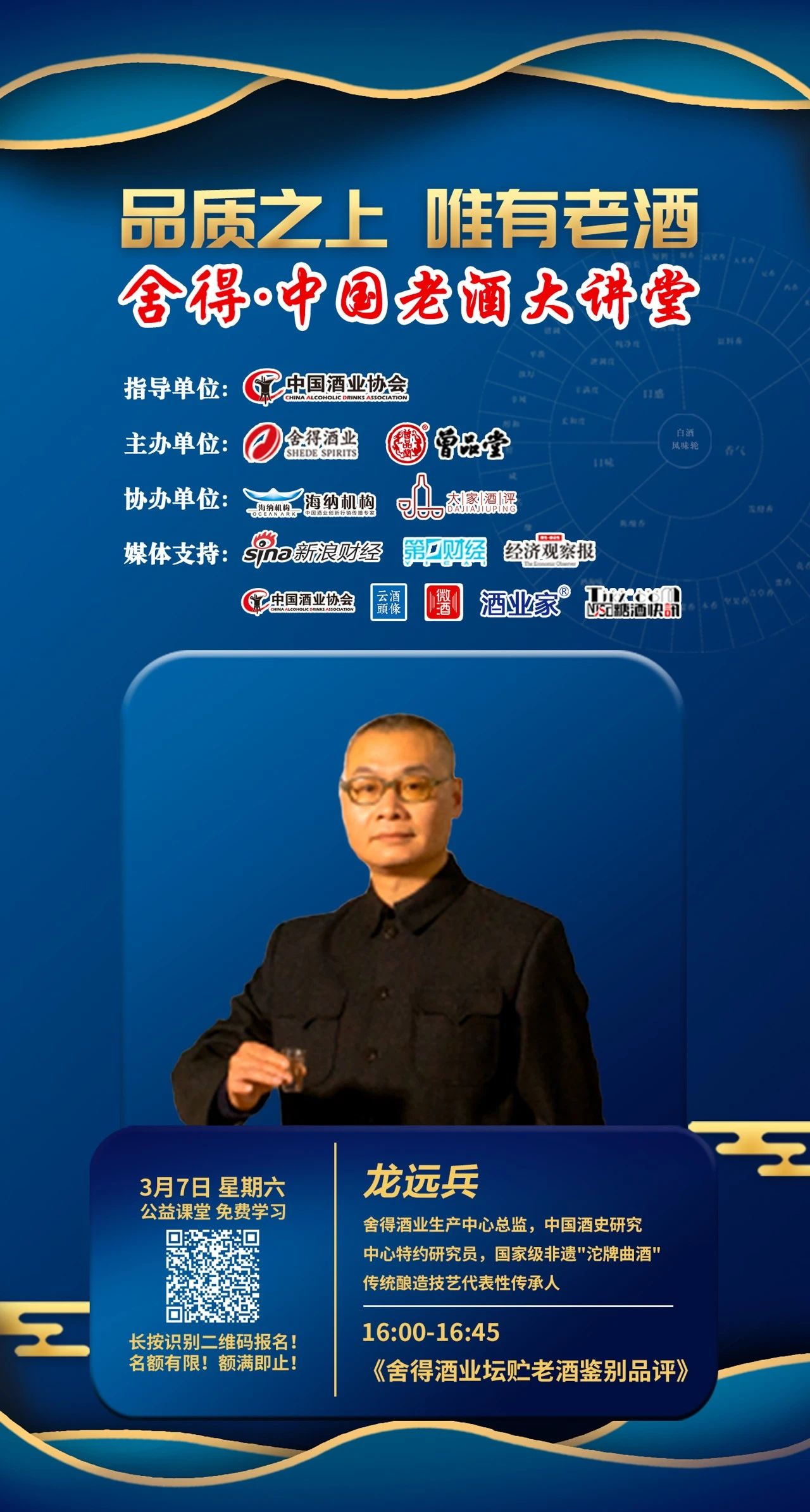 《舍得?中國老酒大講堂》是一門(mén)線(xiàn)上公益直播課程,由中國酒業(yè)協(xié)會(huì )指導,舍得酒業(yè)、曾品堂主辦,海納機構、大家酒評協(xié)辦。節目的開(kāi)播,也標志著(zhù)舍得酒業(yè)中國老酒愛(ài)好者培育計劃正式啟動(dòng)。